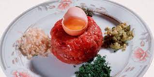 ***Dans un saladier, mélanger vivement moutarde + jaune d’oeuf … Verser peu à peu l’huile sans cesser de touiller pour que la sauce monte comme une mayonnaise ……… Ajouter viande hachée + oignon + câpres + fines herbes + sel + poivre. Travailler cette préparation pour qu’elle devienne homogène et un peu pâteuse.