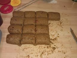 **** Etaler cette pâte sur 1/2 cm d’épaisseur. La couper en rectangles d’environ 7 cm x 2 cm……… Former des petites « saucisses ». Les aplatir légèrement en forme de « Langues de chat » mais plus épaisses.