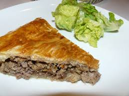 Etaler la farce dans le fond de pâte sorti du frigo……… Recouvrir avec le 2ème rouleau de pâte brisée. Humecter les bords et les souder en appuyant fort et en les rentrant à l’intérieur du moule. Badigeonner le dessus de la tourte avec un jaune d’oeuf.