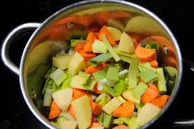 Peler carottes + pommes de terre. Les couper en dés moyens….. Les ajouter dans le faitout + les petits pois + sel + poivre. Porter à ébullition et couvrir pour 30 mn à petite ébullition.