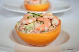 Dans un saladier, mélanger pulpe de pamplemousses ° dés d’avocat + crevettes + jus d’orange...