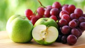 — Dans des bols ou un plat creux et les tapisser de feuilles de laitue ………………… Répartir dessus le contenu du saladier sorti du frigo………………………. Décorer avec les lamelles de pommes + les grains de raisin.