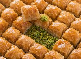 — Montage de la Baklava: – Disposer 1 feuille filo dans le moule; badigeonner de beurre fondu et recouvrir de 3 feuilles filo.………… Etaler 1/3 du mélange de fruits secs au beurre .…………. Recouvrir de 4 feuilles filo ………………. Badigeonner de beurre fondu …….. et recouvrir d’un 2ème 1/3 de fruits secs hachés …………….. Recouvrir à nouveau de 4 feuilles filo…….. Beurrer ……….. Couvrir du reste de fruits secs et leur beurre fondu.………… Couvrir d’une dernière feuille de pâte filo ( ou 2 feuilles) et beurrer généreusement.