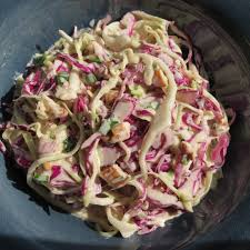 — Dans un saladier, fouetter moutarde + mayo en incorporant peu à peu l’huile d’olive pour obtenir la consistance d’une mayonnaise………………… Sans cesser de battre, ajouter Tabasco + Ketchup + l’ail pelé et haché fin + vinaigre + jus de citron + sel + les épices cajun…………….. Incorporer les lanières de choux + poivrons + oignons et mélanger soigneusement.