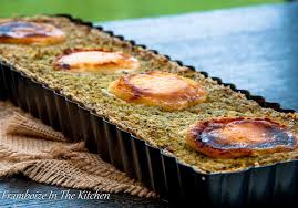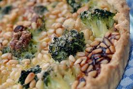 — Sortir le moule du frigo. Badigeonner le fond de tarte avec le jaune d’oeuf ….. Etaler dessus la purée de brocolis .……………. Couper les crottins en rondelles … Les disposer sur la purée de brocolis ………………….. Parsemer de pignons …………….