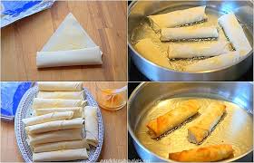 Faire chauffer fortement dans une poêle de l‘huile de friture ………… Y faire dorer les « cigares » environ 5 mn……………… Les sortir sur du papier absorbant.