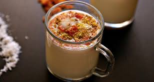 Avant de servir froid, poudrer de gingembre ou de cannelle + des boutons de roses pilés.