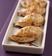 Abaisser la pâte feuilletée ou brisée. Y découper des ronds avec un emporte-pièce ou avec un verre retourné……………………….. Déposer 1 c à c de garniture au milieu de chaque disque de pâte ………………… Plier la pâte en 2 et former un petit ourlet pour bien joindre les bords.