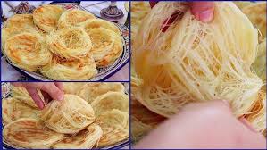— Avec les doigts bien huilés toujours, sur un plan de travail beurré, prendre chaque boulette et l’aplatir en un ruban de 1 cm de large sur 3 mm d’épaisseur ……………………………. Continuer à rouler cette bande pour obtenir un long fil de 2 mm de diamètre …………. Enrouler ce fil autour de vos doigts de la main gauche ………………. et glisser le tout sur le plan de travail ………………… Former un rond de fils de pâte légèrement aplati: Vous obtenez une galette de fils ..…..