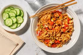 — Dans un wok ou une grande poêle sur feu vif, chauffer 2 c à s d’huile … Y faire sauter ail + oignons 2 mn …………….. Ajouter poulet + crevettes + sel . Faire sauter 2 mn ……………. Ajouter chou + sauce soja + pâte de piment …. Poursuivre la cuisson 5 mn sans cesser de remuer … Ajouter les nouilles cuites + les lanières d’omelette. Faire sauter 2 à 3 minutes ……..