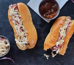 Composer votre Hot bun’s en tartinant les 2 moitiés intérieures de moutarde …………. Déposer le chou/Mayo ….. puis la viande chaude.
