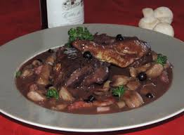 —Dans une cocotte, chauffer un peu d’huile, Y faire dorer les morceaux de pintades ( 7 à 8 mn) … . Les sortir de la cocotte. A leur place, après avoir baissé à feu doux, y faire suer 5 mn oignons + champignons ………… Remettre les morceaux de pintade sur les oignons ….. Poudrer de farine et mélanger 1 mn ……… Arroser de vin rouge. ajouter ail + sel + poivre. Mélanger. Couvrir. Laisser doucement mijoter 1 h.