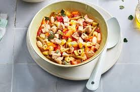 Incorporer tous les légumes préparés: céleri + tomates + haricots verts + petits pois + poivrons ….. Mélanger et poursuivre la cuisson 5 mn en portant à ébullition ………………