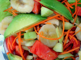 Dans un saladier, faire la vinaigrette en fouettant ail + moutarde + huile + vinaigre + sel + poivre. Ajouter tomate en morceaux + concombre haché + céleri émincé + carottes râpées .…….. Tailler les bananes en rondelles d’1 cm d’épaisseur …. et les ajouter. Mélanger le tout délicatement.