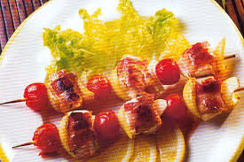 Enfiler sur chaque brochette, en alternance, poisson/ lard… poisson/ tomate .. poisson /lard …...