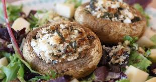 Placer les têtes de champignons ( creux au-dessus), côte à côte, sur un plat pour le four …………… Remplir les têtes de champignons de la farce contenue dans le bol ………