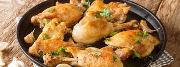 –Dans une cocotte, chauffer l’huile. Y faire bien dorer les morceaux de poulet + les 6 gousses d’ail restantes restées » en chemise » ( = non pelées), de tous côtés ………..