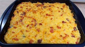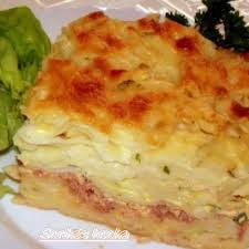 —Dans un saladier, battre 4 jaunes d’oeufs + crème aigre + jambon haché + sel + poivre ….………. Ajouter les nouilles cuites et bien mélanger …………. Battre légèrement les blancs d’oeufs en neige …. et les incorporer.