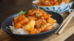 — La sauce: – Dans une casserole, chauffer l’huile. Y faire doucement suer les oignons 3 mn en les remuant ……………………. Ajouter quartiers de mandarine + dés d’ananas et remuer 2 mn ……………………. Poudrer de fécule. Mélanger et arroser de bouillon en touillant toujours … + glutamate ….. + la marinade du poisson + sel + poivre .…. Laisser tout doucement réchauffer.