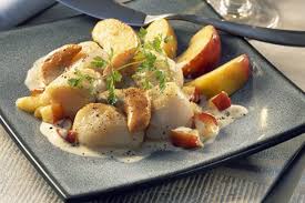 —Dans une casserole, fondre 50 g de beurre. Y faire doucement suer les échalotes 3 mn .…………. Ajouter les noix de st Jacques et leur corail + sel + poivre. Remuer 2 mn .…. Verser le cidre et touiller 1 mn …………… Sortir les st Jacques à l’écumoire et les mélanger aux pommes ( toujours hors du feu)……..………