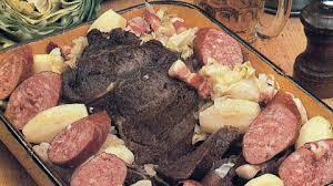 Dans une autre marmite, verser un fond d’eau ( ou le reste de bouillon). Y déposer les chou + le reste des carottes + le reste des oignons + le lard. Couvrir pour 1 heure de cuisson douce. Ajouter le saucisson à cuire. Couvrir à nouveau et poursuivre la cuisson 1 h de +. ( toutes les viandes & légumes doivent avoir fini de cuire en même temps).
