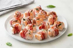 —–Envelopper chaque dé de saumon d’1/2 feuille de sauge … puis d’1/2 tranches de bacon. les maintenir avec un pic en bois …….. Les poser au fur et à mesure dans le plat à gratin ..