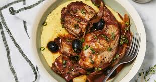 Dans une cocotte sur feu moyen, chauffer huile + beurre …………………………………… Ajouter ail + romarin + sauge + laurier. Réchauffer 2 mn …………… Déposer les morceaux de lapin. Les faire dorer de tous côtés ………………… Mouiller avec le vin rouge + muscade râpée + sel + poivre. Laisser le vin s’évaporer qq mn ……….. Ajouter tomates + noix + olives. Couvrir et laisser doucement mijoter 45 mn.